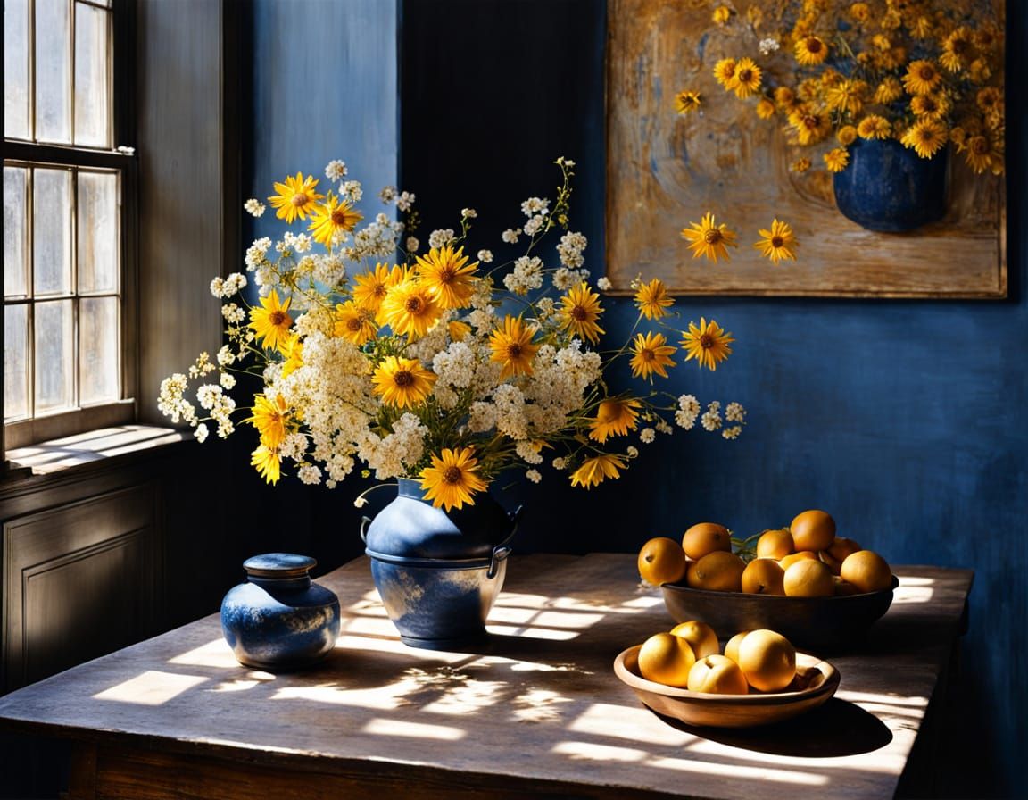 % && Old butcher Table by a large bright window bundles of arranged Dry flowers golden and delft blue in a dimpled copper bucket whitewashed walls contre-jour god rays radiant rays Jackson Pollock Vermeer striking hyper real painting atmospherics
