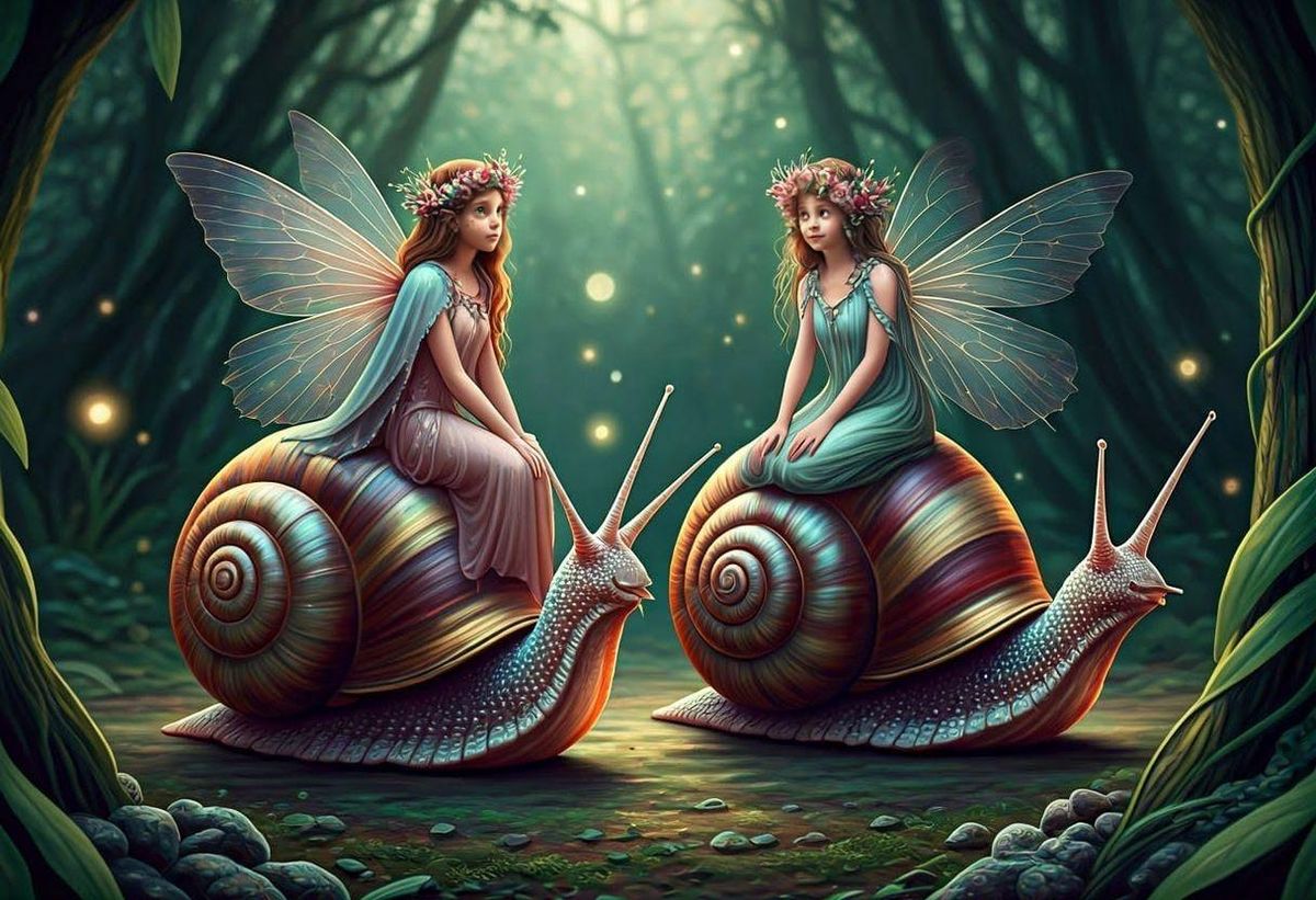 This image shows two winged fairies participating in a snail race. The magical scene captures the whimsical nature of the fairies as they guide their snail steeds.