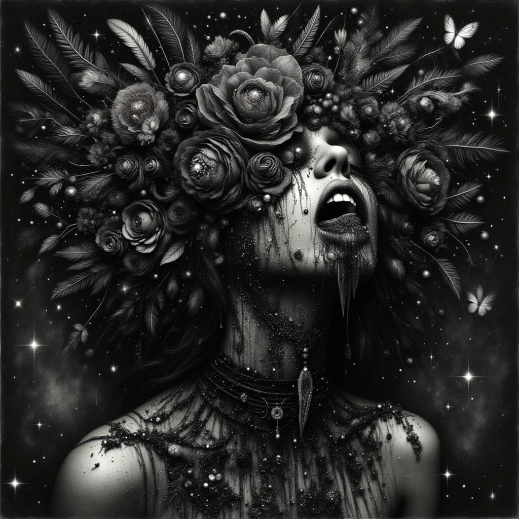 This image shows an elderly African woman with heavily wrinkled dark skin, depicted in a macabre gothic style. The pencil drawing features black feathers, dark makeup, florals, and jewelry against a hazy starlit background.