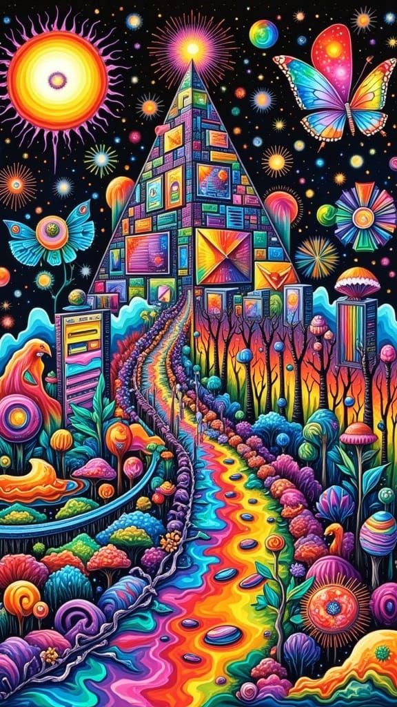 This vibrant image depicts a swirling chaos of colors and patterns, reminiscent of a child's imagination, blending politics and warfare in a dreamlike quality, with geometric abstractions and the unpredictability of bleeding colors, in a style that combines neo-expressionism and surrealist flair.