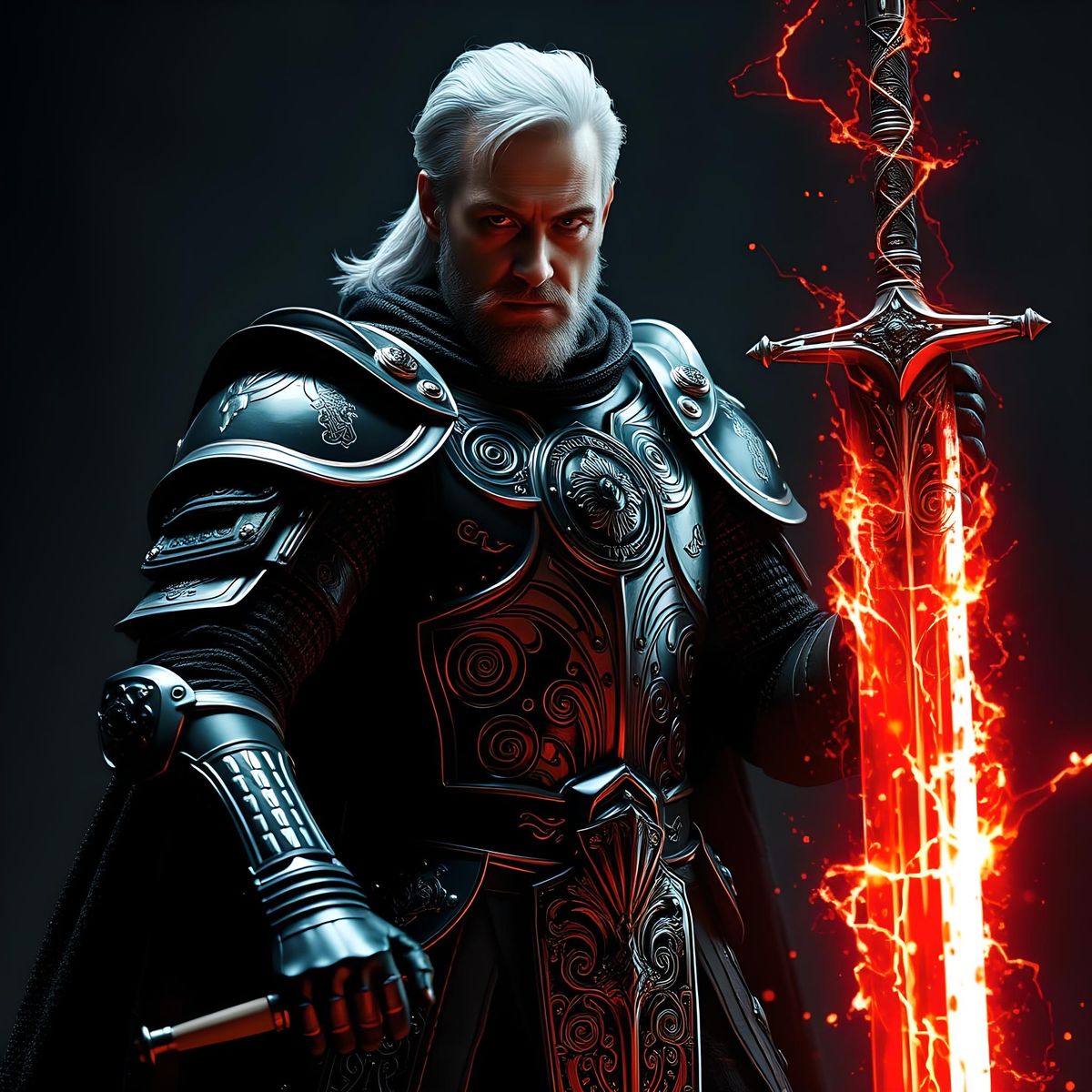 A striking picture of a gray-haired knight in black and chrome void armor. The armor features glowing runes and swirling plasma, with the knight holding a sword crackling with crimson lightning, captured in photorealistic digital art.