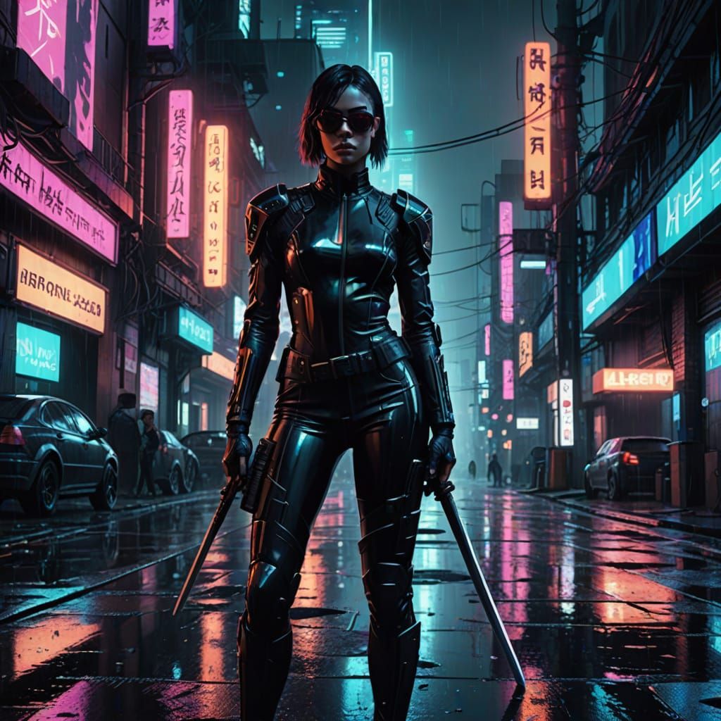 A dramatic, high-contrast image of a woman in a black leather bodysuit, holding a katana, set against a futuristic cityscape with neon lights and dark clouds, evoking a dark and moody, cinematic atmosphere reminiscent of Blade Runner and Syd Mead's iconic sci-fi designs.