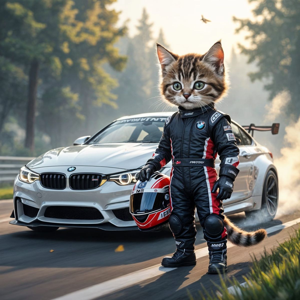 This image shows an anthropomorphic kitten in a racing suit ready to race next to a BMW. The detailed digital art is reminiscent of ethereal fantasy paintings.