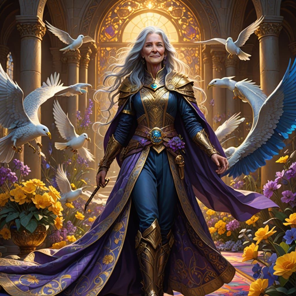 This digital matte painting features a smiling 65-year-old woman with gray hair and blue eyes, adorned in a gold, silver, and violet quilt. She stands on a python amidst flowers and doves, bathed in golden hour light.
