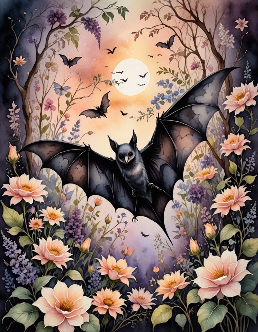 Create your own romantic gothic watercolor paintings of bats and flowers using our free AI image generator.