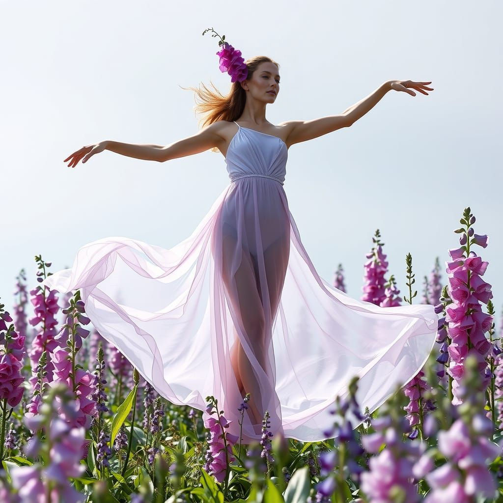 A model performs a ballet-inspired dance in a field of foxglove flowers, her body adorned in a flowing dress made from the bell-shaped blooms of the plant. The soft purple hues of the flowers create a contrast with the delicate and athletic curves of her well-toned body. Her arms stretch above her, while the long, billowy skirt moves with her fluid motions, mimicking ..."