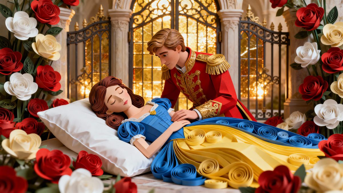 This image showcases a detailed 3D paper quilling artwork of a prince in a red and gold uniform over a sleeping princess. Soft light illuminates the romantic scene with paper roses and an ornate gate.