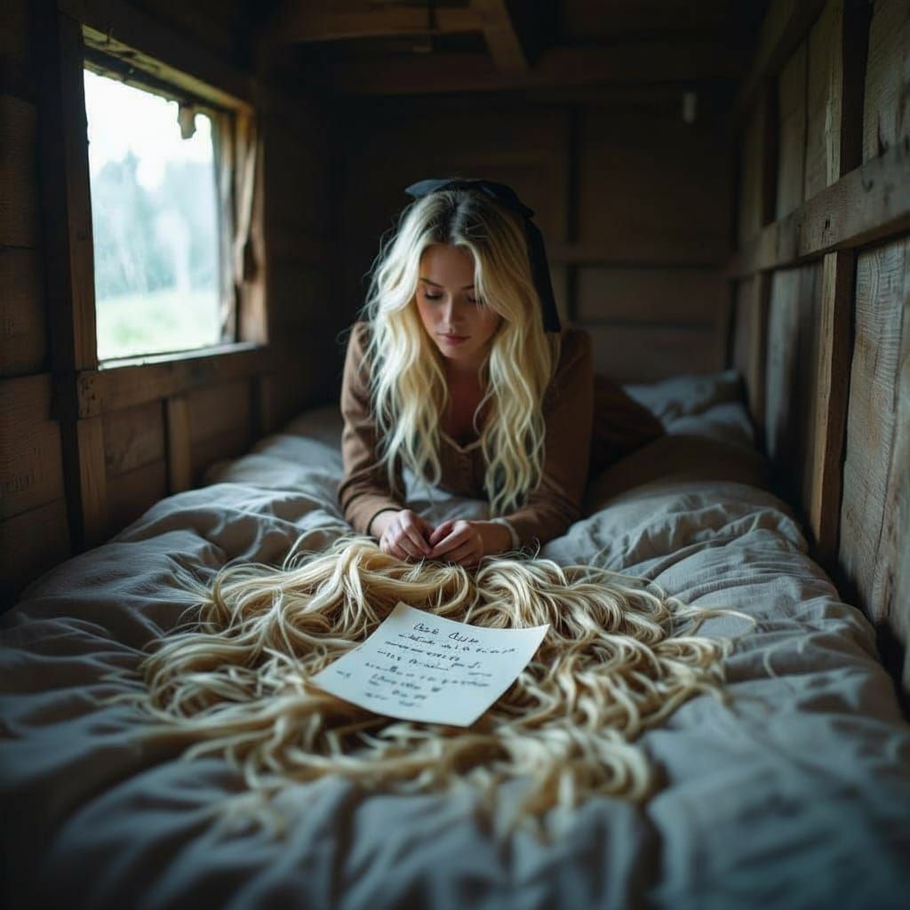 A dramatic cinematic film still captures a woman discovering a note amidst blonde hair on a narrow cot in a small hut, featuring atmospheric lighting and film grain.