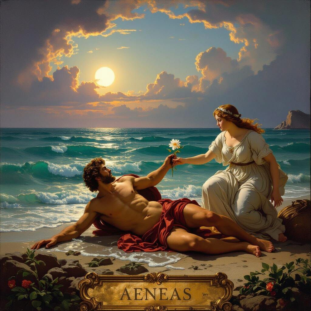 This image depicts Aeneas arriving exhausted on the Lazio coast, with a maiden offering him a flower. Rendered in an epic historical style with dramatic lighting and vivid colors.
