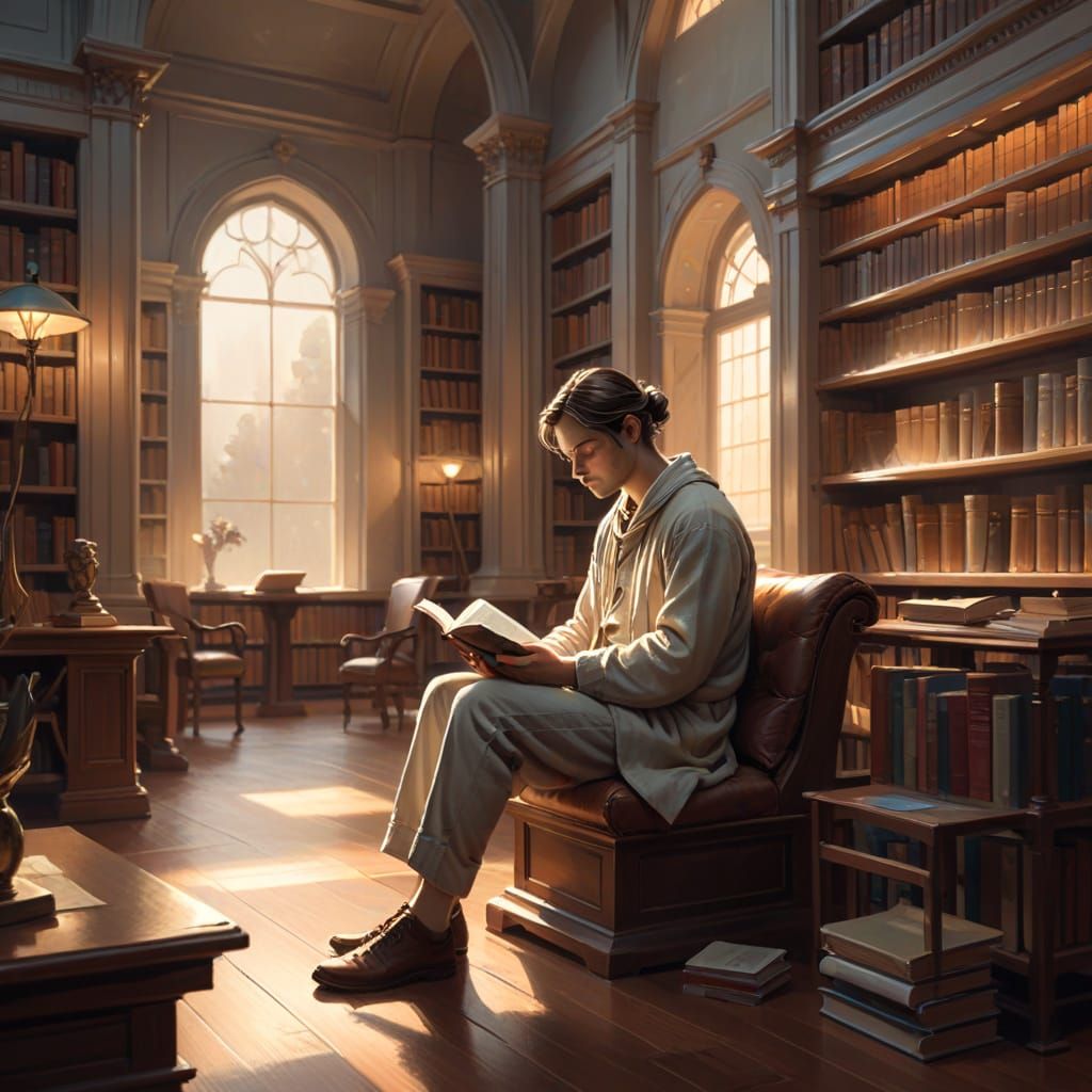 This digital painting depicts a serene scene of a figure absorbed in reading within a quiet library. The artwork features intricate details, soft lighting, and a muted color palette, creating a deeply calming atmosphere.
