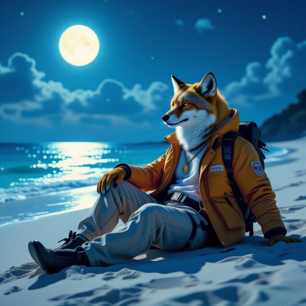 A striking picture of a Tigerman character relaxing on a beach under moonlight. The image, in a hyperrealistic style, features cinematic lighting, film grain and a vignette effect.