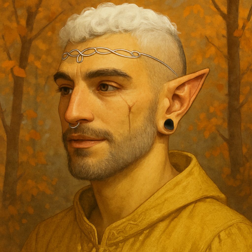 This image shows a male elf with light yellow skin and curly white hair, adorned with piercings and a diadem. He has a peaceful expression and is dressed in yellow elven clothing.