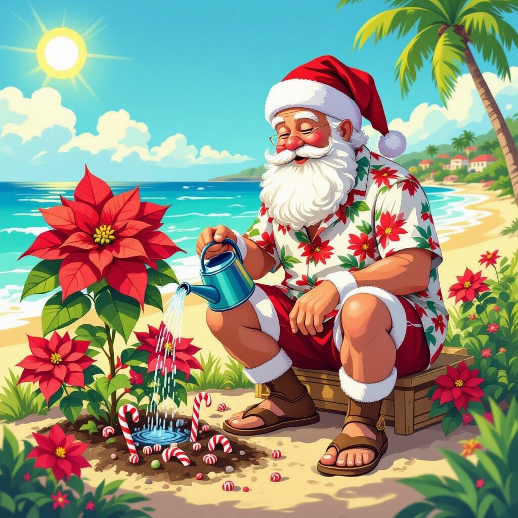 This image shows a cheerful Santa Claus in casual beachwear tending a vibrant garden filled with exotic flowers and candy canes, set against a sunny beach backdrop, in a whimsical illustration style.