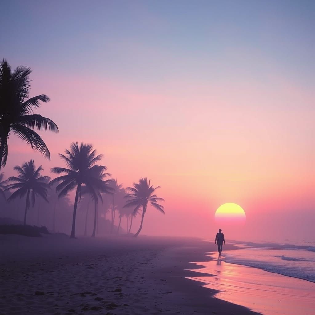 This image captures a serene beach at dusk, with warm pastel hues and a nostalgic, retro-futuristic atmosphere. Palm trees sway gently in the breeze, while a lone figure walks along the shoreline, set against the vibrant colors of the setting sun.