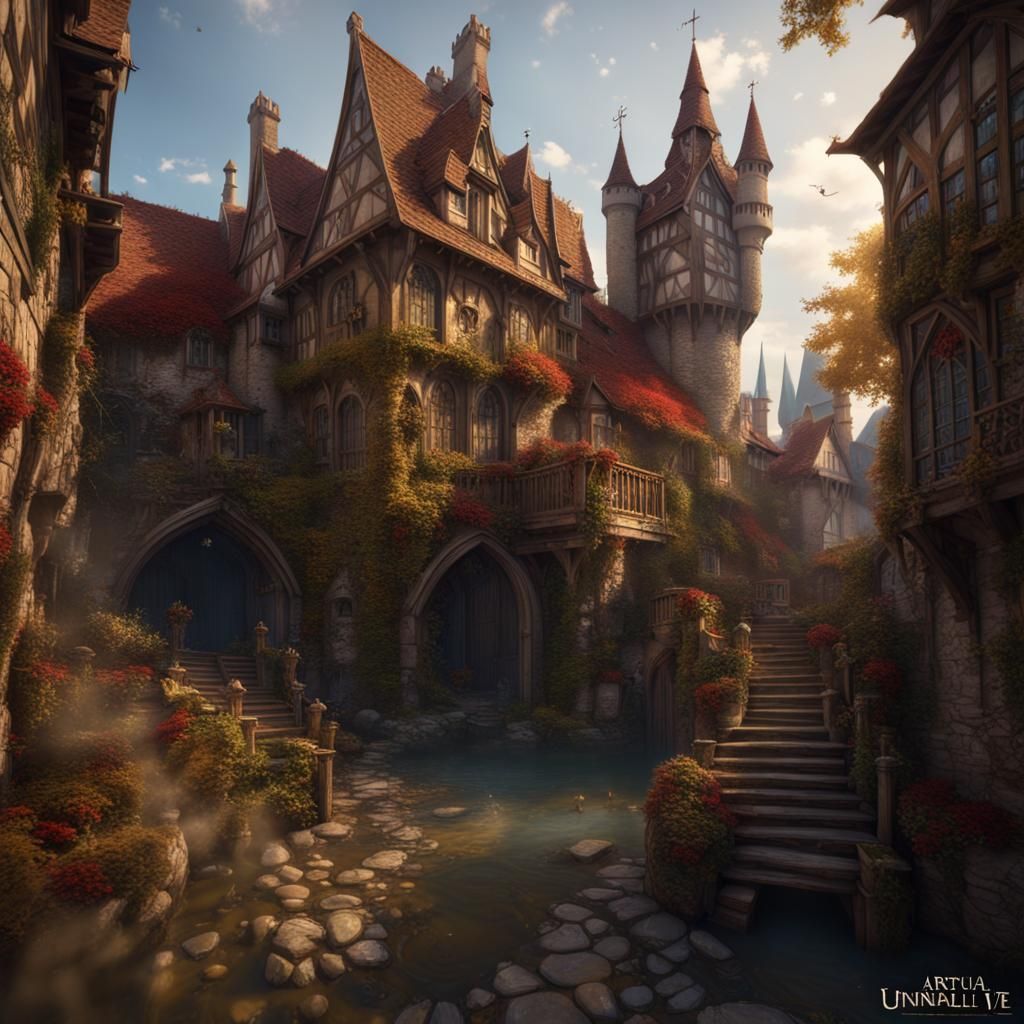 A medieval scene featuring an illuminated letter E. The artwork uses a detailed matte painting technique with deep colors and intricate details, reminiscent of fantasy concept art in 8k resolution.