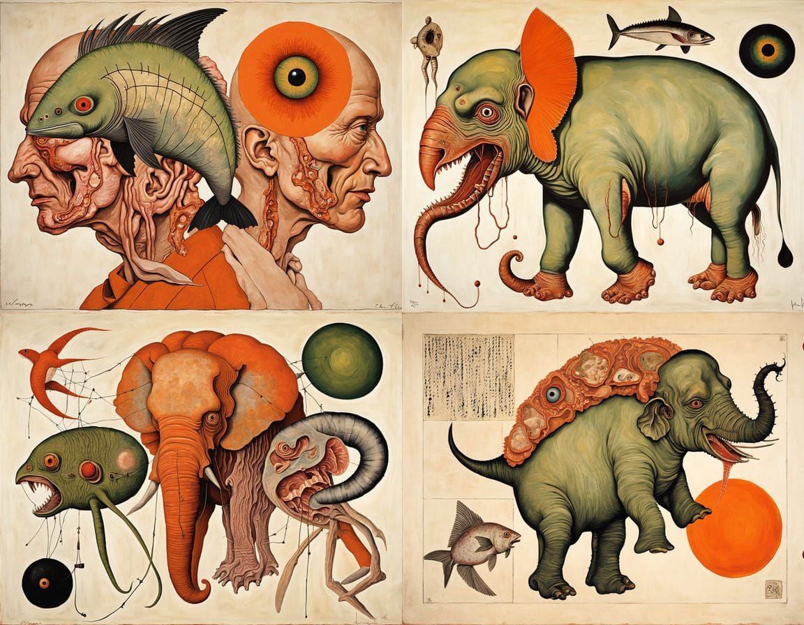 This image shows a bizarre mythical creature, a hybrid homunculus with neon green and orange hues. The artwork displays surreal anatomical elements in an Ukiyo-e style, reminiscent of oil paintings.