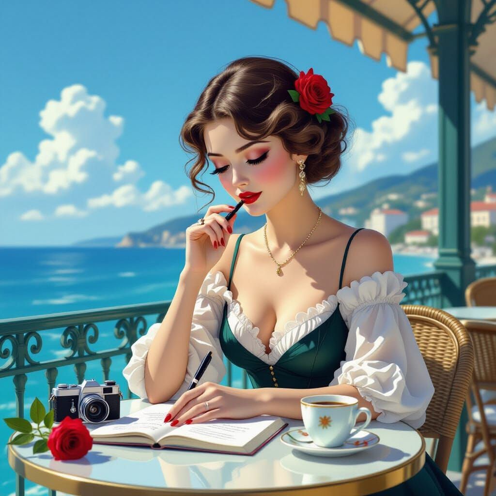 This image shows a porcelain-skinned woman writing in a journal at a charming cafe. A rose and vintage camera sit by her coffee, with a blue sky and sea backdrop, in a soft, painterly illustrative style.