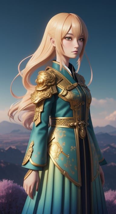 This image shows a girl standing in a fantastical landscape, rendered in a vibrant anime style. The artwork features glowing accents, intricate patterns, soft backgrounds, and warm, golden lighting as 3D anime art.