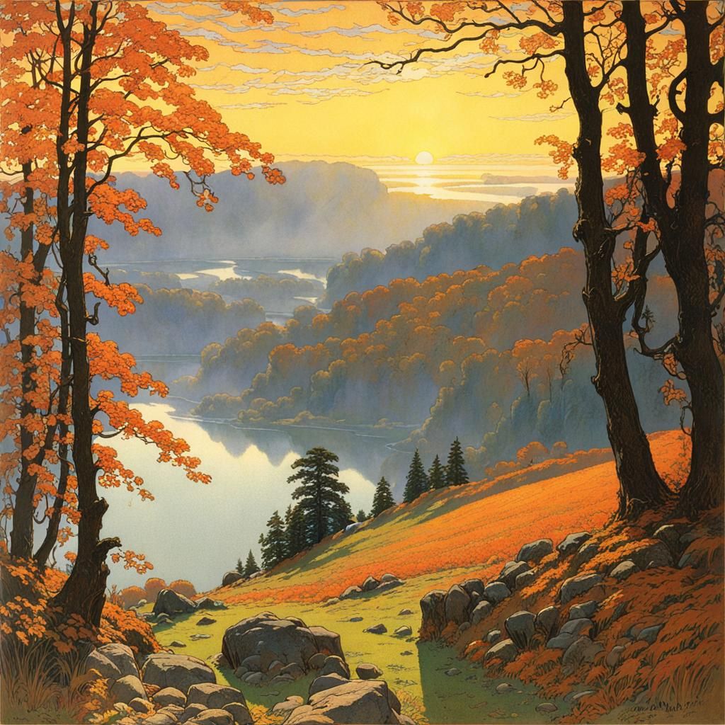 This image depicts a serene autumn morning with lingering fog over a river valley. The artwork is inspired by Art Nouveau and classic illustration styles.