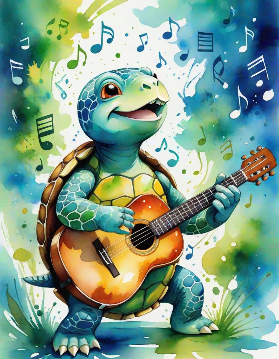 A vibrant watercolor image of an anime-style turtle serenading with a guitar, surrounded by musical notes. The playful artwork captures the joy of music.
