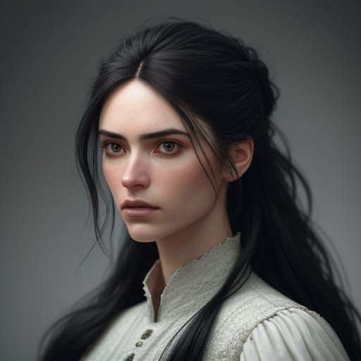 This image shows a hyper-realistic medium shot portrait of a woman. She has an unusual hairstyle, captured with delicate detail and subtle textures in a cinematic and atmospheric style.