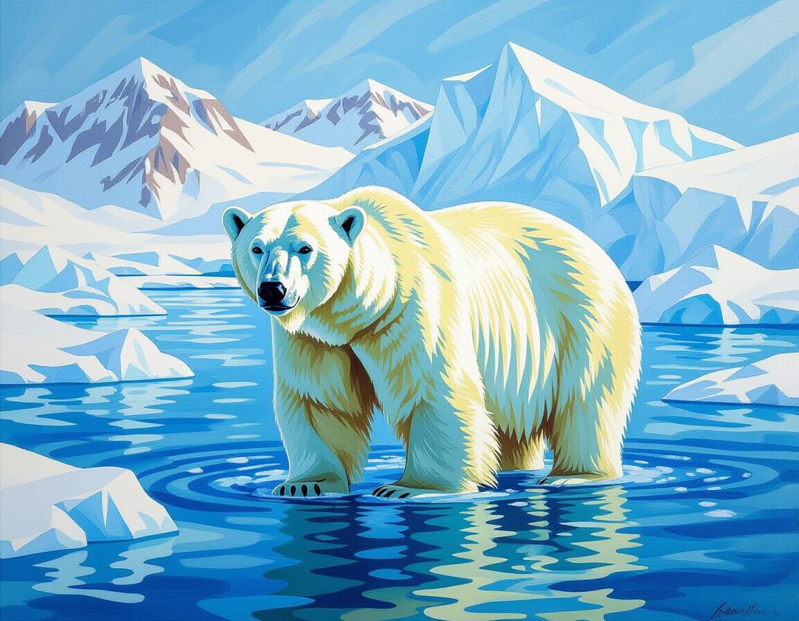 A detailed gouache painting of a polar bear in its Arctic habitat. The vibrant artwork features icy waters, snow-covered icebergs, and a thick-coated bear depicted with expressive brushstrokes.