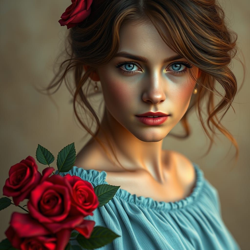 image of a young woman with long, wavy brown hair and blue eyes. She's wearing an off-the-shoulder light blue blouse. Her gaze is direct and thoughtful. Accented by roses and leaves surrounding her, painted in deep red and green hues. Background is soft and out of focus in earth tones.