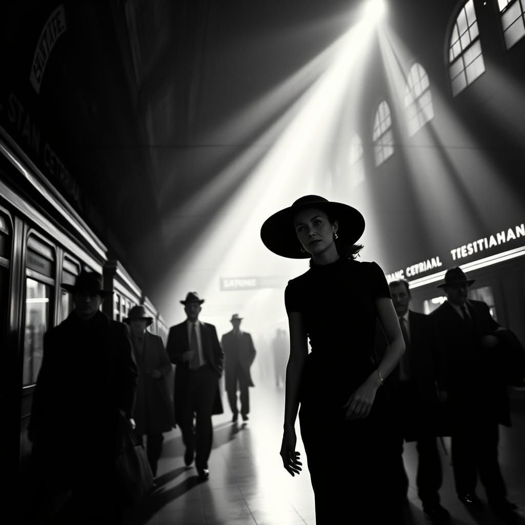 This image shows a mysterious woman in a hat and dress entering Grand Central Terminal. The monochrome image evokes a 1960s cinema noir aesthetic, complete with dramatic lighting and shadowy figures.