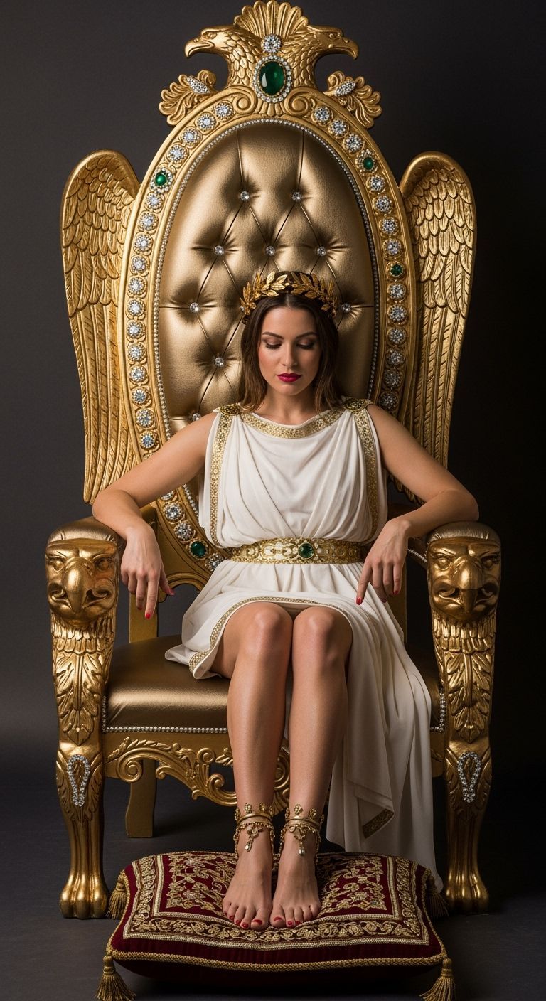 This image shows a Roman Empress on a golden throne, complete with velvet upholstery and emerald and diamond ornamentation. The studio photograph features the subject in a white and gold toga, with attention to detail reminiscent of classical portraiture.