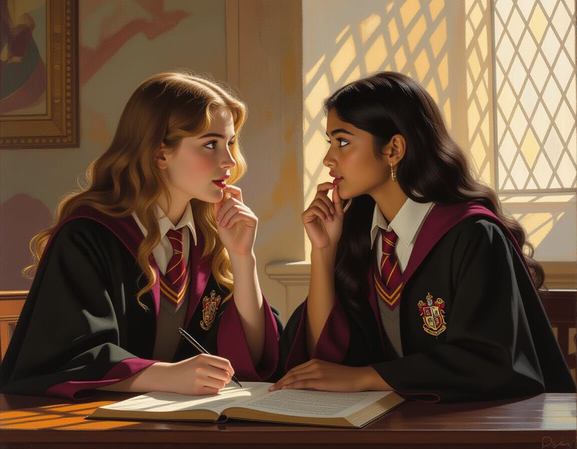 This Renaissance-style painting shows Lavender Brown and Parvati Patil in Gryffindor robes, sharing secrets during a Hogwarts class. Dramatic lighting and rich textures enhance the scene, reminiscent of Michelangelo's frescoes.