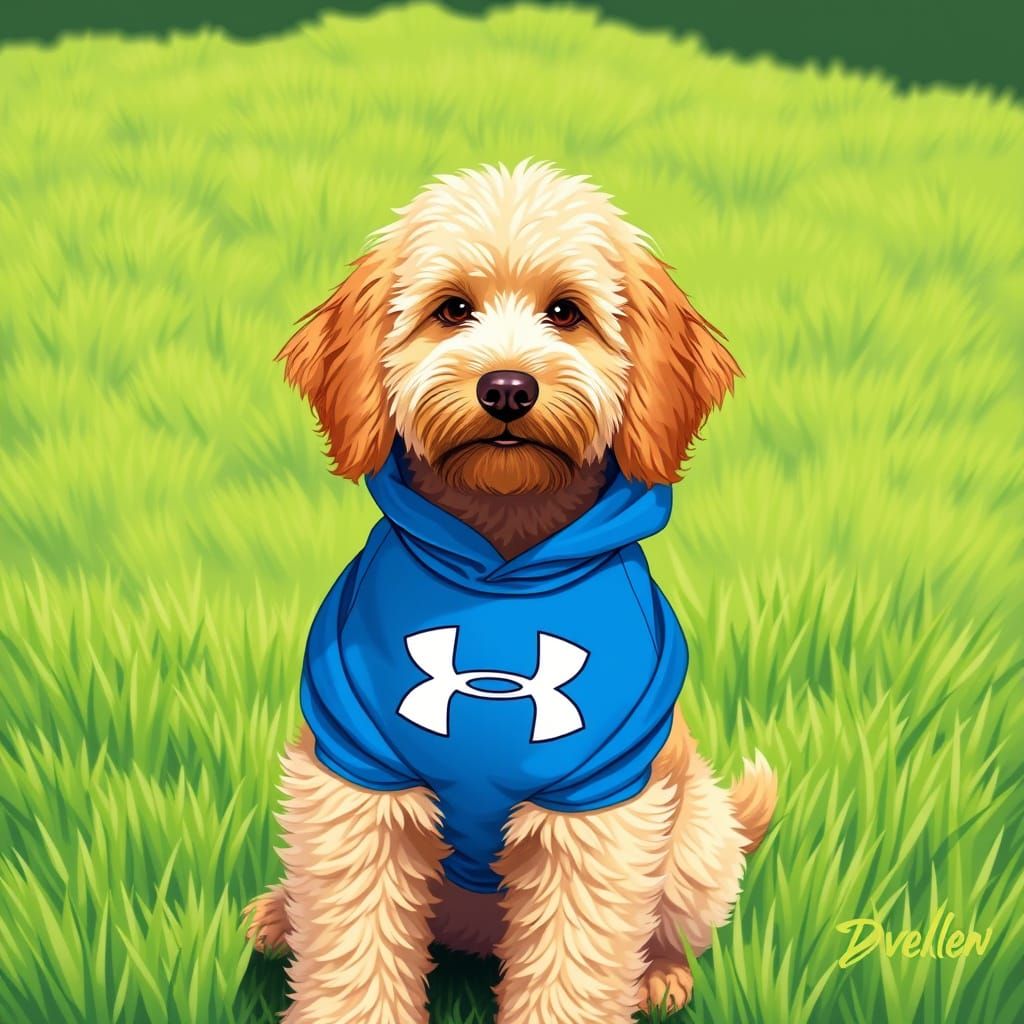 This image shows a happy golden doodle posing on a lush green lawn, wearing a bright blue Under Armor sweatshirt with a white logo, in a warm and inviting style with soft textures and vibrant colors.