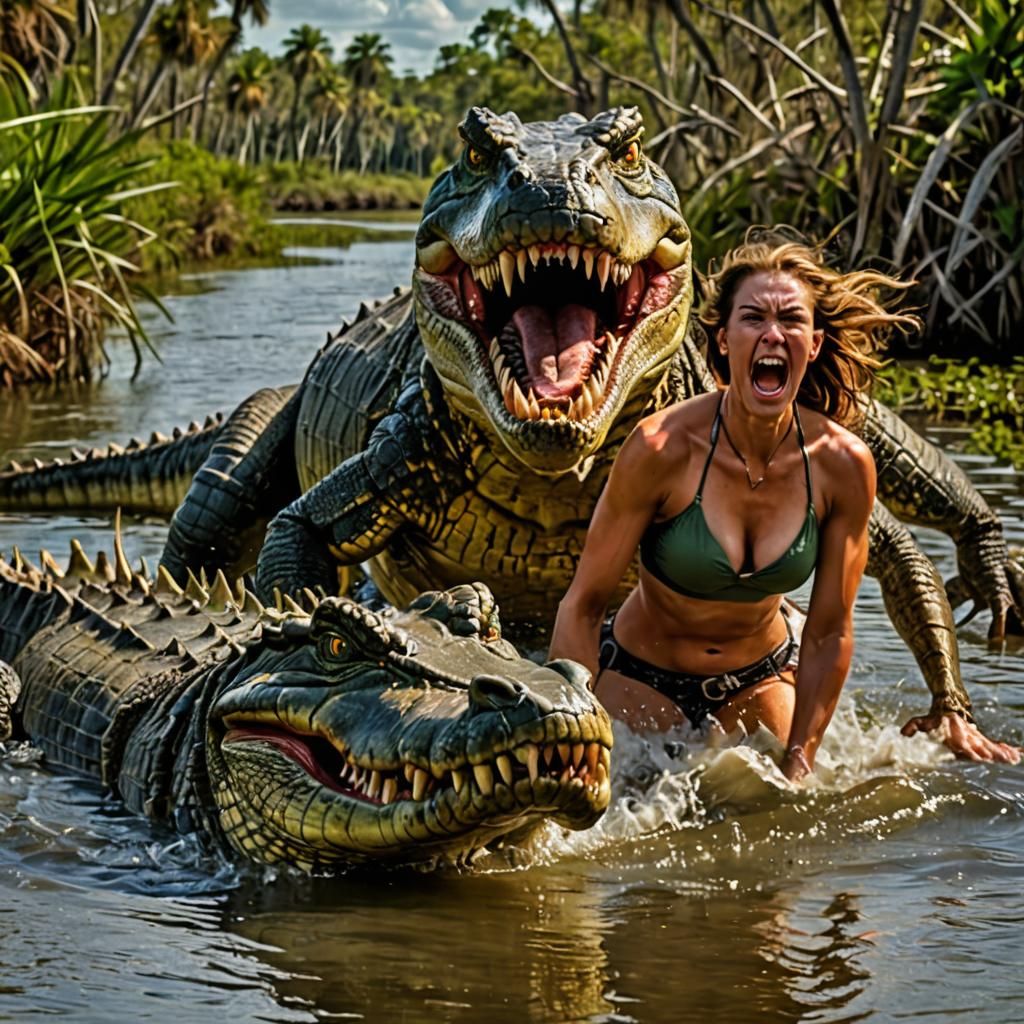 This image depicts a dramatic scene of a man being pulled into a swamp by a crocodile, while a woman runs towards him. The artwork has hyperrealistic detail, cinematic lighting and high contrast.