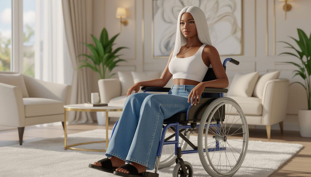 This image shows a hyperrealistic, animated-style portrait of a young African woman with white hair, wearing jeans and a crop top, seated in a wheelchair in a luxurious room. Rendered with advanced 3D shading and cinematic lighting.