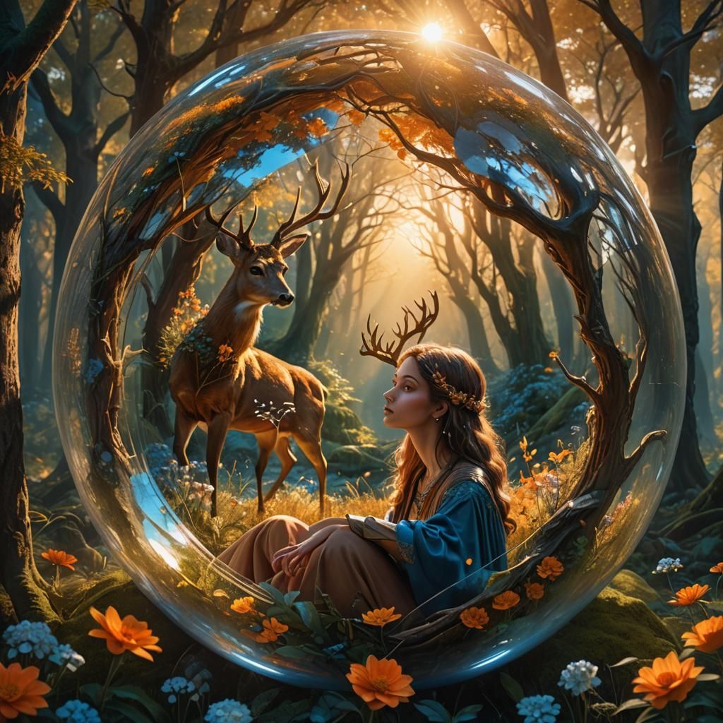 A matte painting shows a girl inside a clear sphere in a forest. Deer and flowers surround her as golden sunlight illuminates the scene with vibrant colors and intricate details. Fantasy concept art.