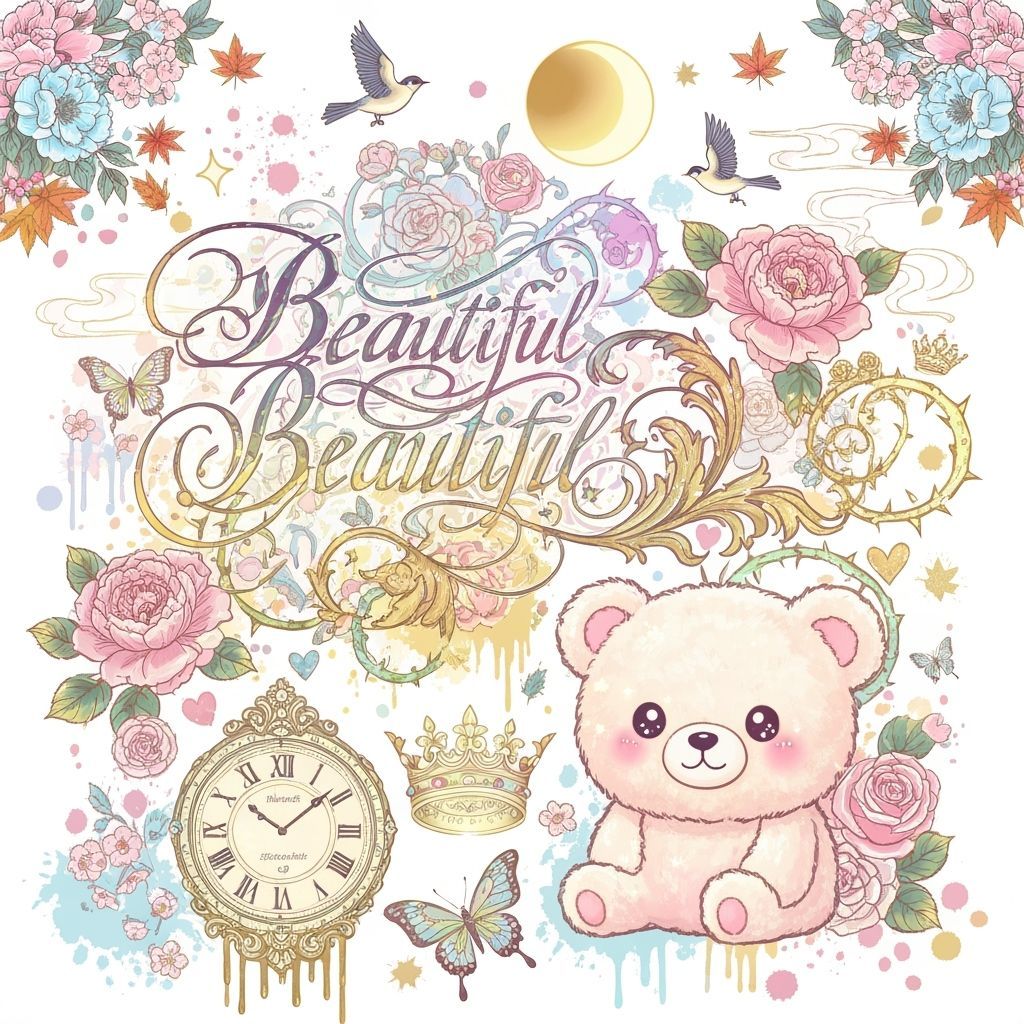 A whimsical illustration with a dreamy, ethereal feel. The word "Beautiful" is written twice in an elegant, ornate script at the center, surrounded by a lush arrangement of pink and blue roses. The design also features a charming teddy bear with sparkling cheeks, a vintage-style clock, and other magical elements like butterflies, crowns, and a crescent moo