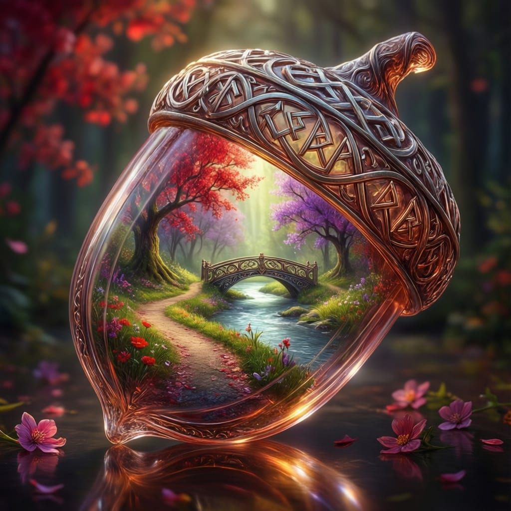 <lora:Celtic runic design:1.0> A beautifully crafted transparent acorn with ornate runic metallic detailing sits on a reflective surface. Inside, it showcases a serene spring landscape, featuring a winding path leading to a winding river featuring an ornate bridge surrounded by vibrant red and purple ...