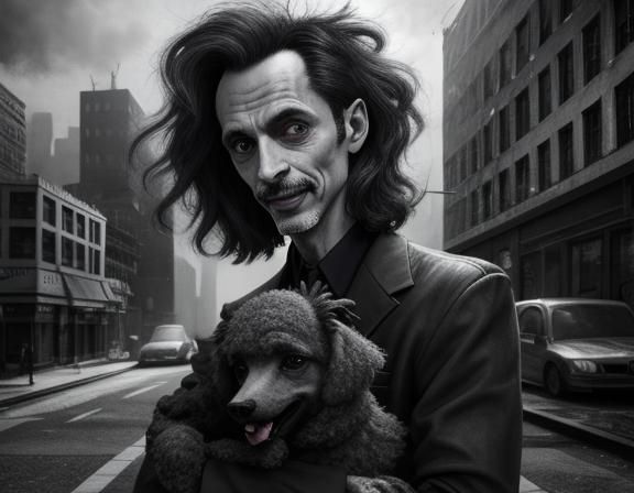 (in color:1.3). Photorealistic high 8K resolution. Deep saturation, high contrast. Dynamic angle. 25-year-old (John Waters:1.2) in business suit (with extremely thin extremely thin pencil mustache:1.2) (smiling big:1.3) (holding a light gray poodle on this arms:1.2) Textures of skin, hair, clothes and ...