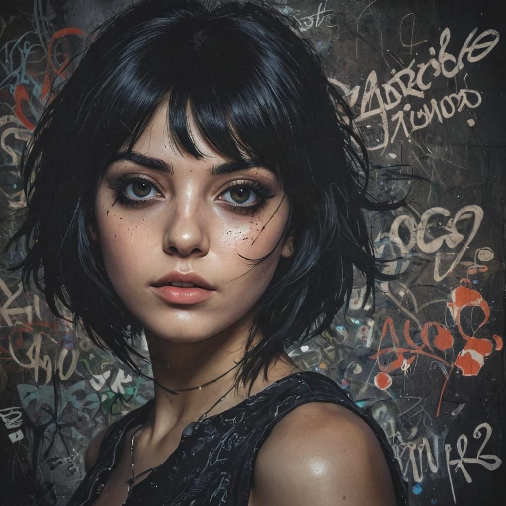 A digital watercolor of an emo girl with dark hair and heavy eye makeup, reminiscent of the 1960s, set against a charcoal background with graffiti. This stylized illustration features dramatic lighting and intricate details.