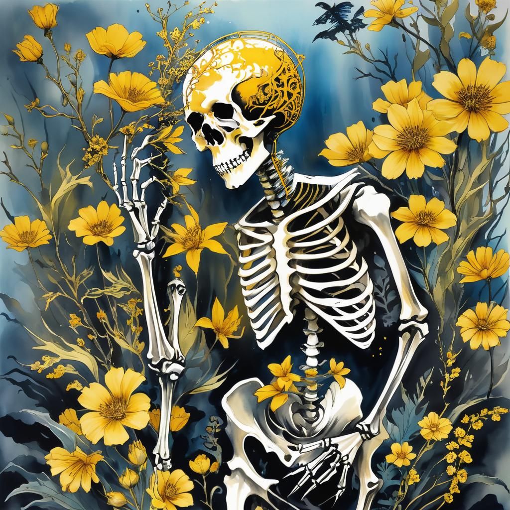 This image shows a complex, tangled skeleton arcology with golden flowers in a Chinese ink painting style. The design incorporates mermaidpunk and metalcore aesthetics.