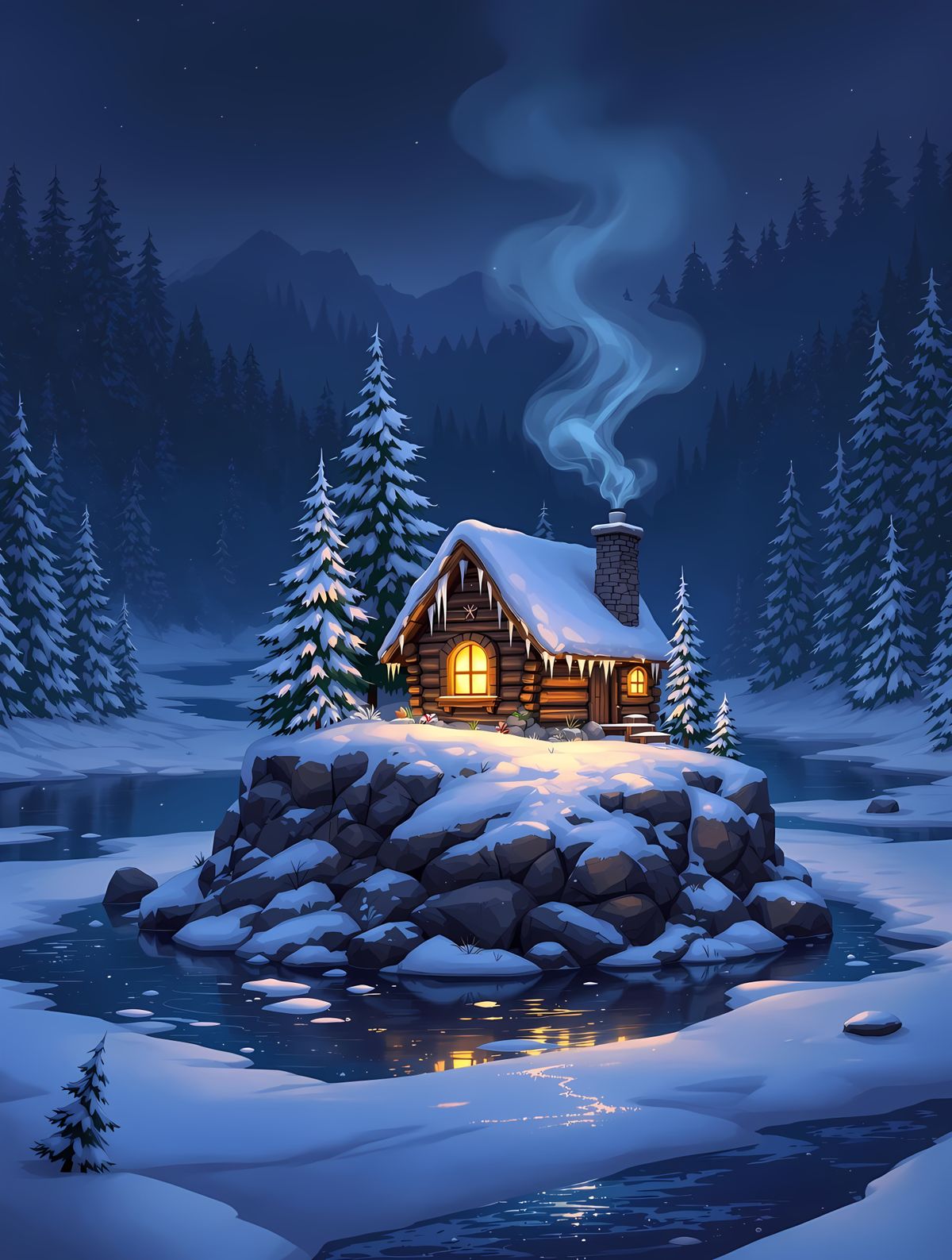 This image shows a charming fantasy cabin nestled in a snowy forest, surrounded by pine trees and a frozen river, under a dark twilight sky, evoking a cozy and inviting atmosphere.