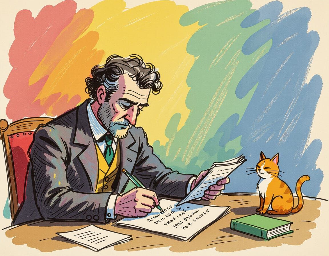 A whimsical image of Roman poet Catullus composing a poem. This abstract art piece features complementary colors and fine details, rendered in a playful, illustrative style.
