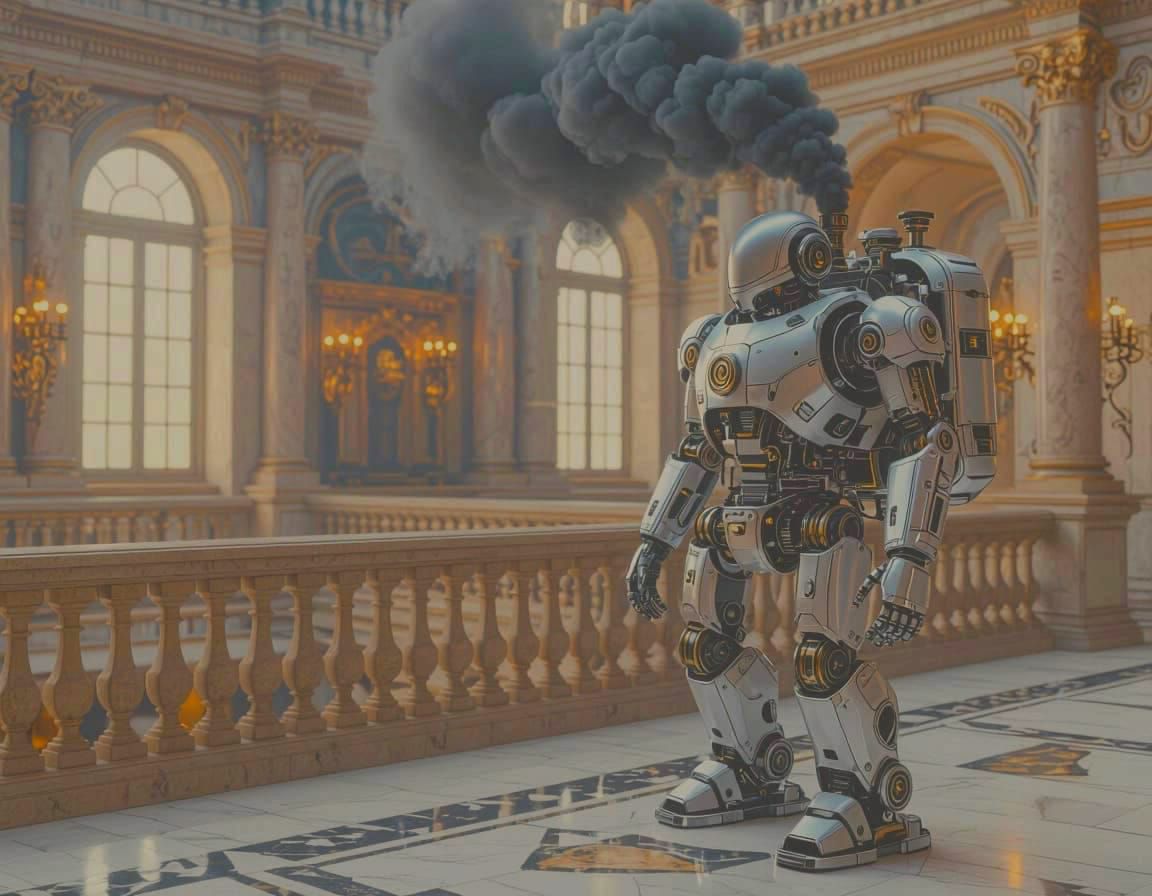 A ground-level shot of a robot with a steam engine on its back, standing on a baroque balustrade. Intricate mechanical details are visible in this futuristic, cinematic image.