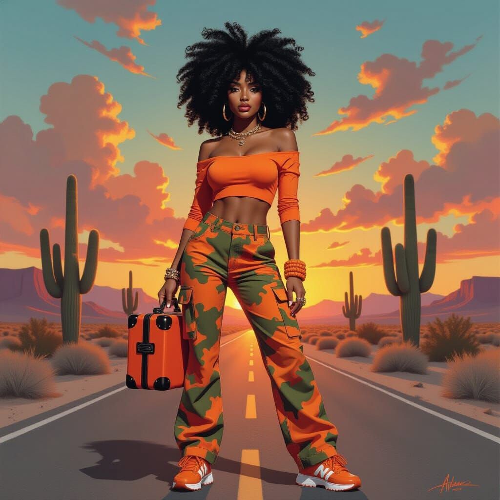 This image showcases a regal African-American woman on a desert road at sunset, depicted in a vibrant abstract oil painting style with graffiti and splash art influences. High contrast and rich colors define the scene.