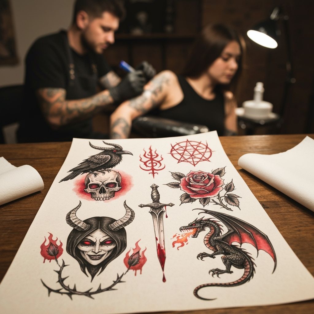 This image shows a dark fantasy tattoo flash sheet featuring hyper-detailed, fine-line black ink illustrations with red watercolor accents. The tattoos include skulls, ravens, daggers, and dragons in a traditional style.