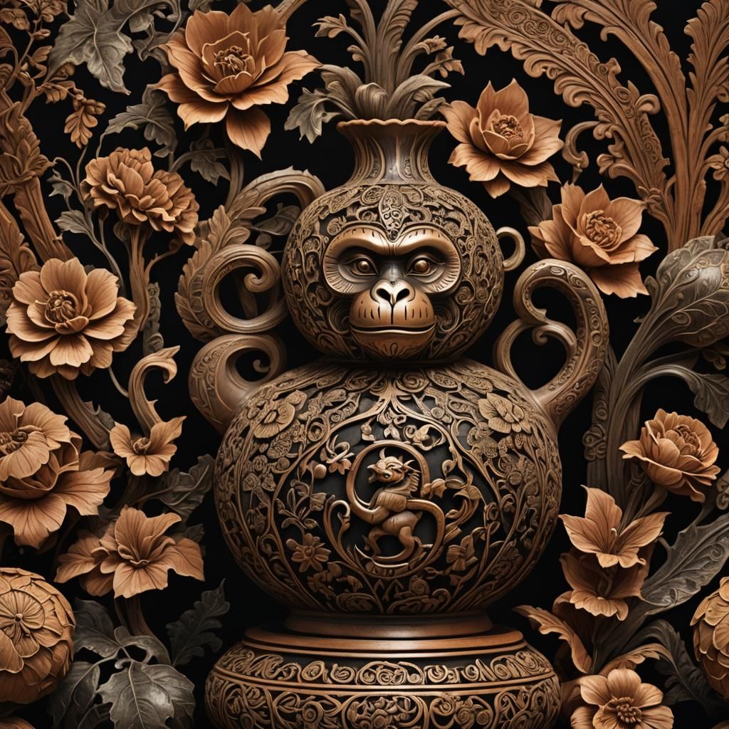 A captivating still life of an ornate gourd vessel. The detailed carving features floral patterns and a monkey warrior in bas-relief. The bronze and terracotta tones are accentuated by cinematic lighting.
