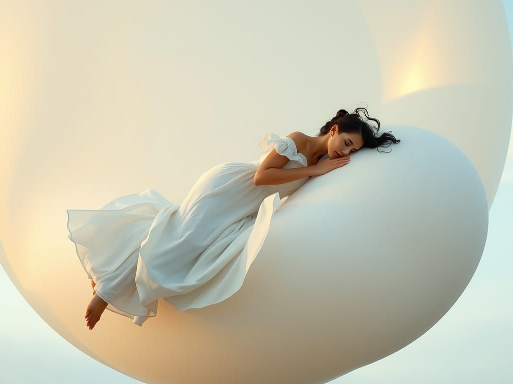 This image shows a woman in a white dress reclining on a large, soft, cloud-like balloon. The translucent material gently envelops her form, creating a dreamy and ethereal atmosphere as digital art.