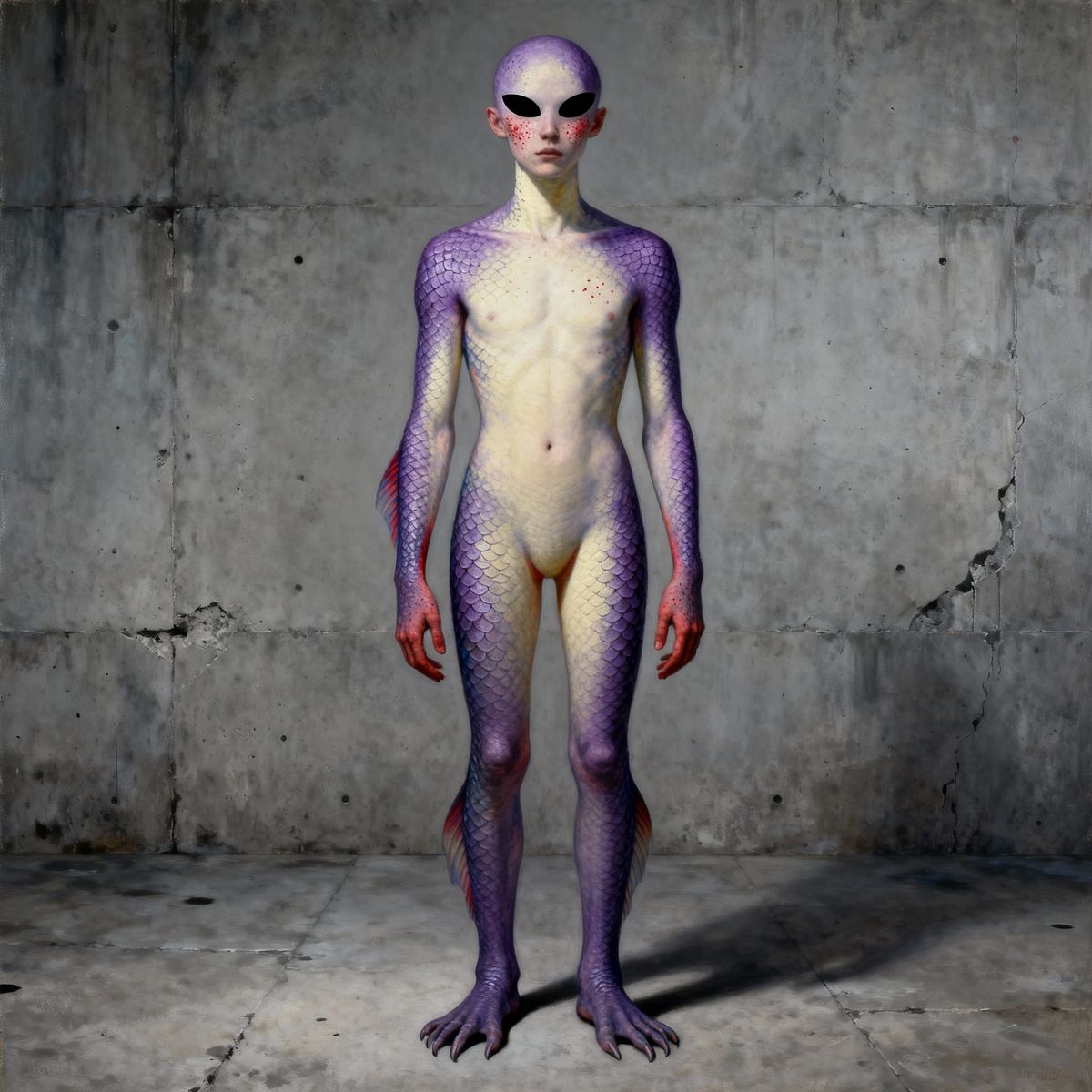 This image shows a slender, androgynous humanoid with unique features, scaled skin, and webbed extremities, painted in a surrealist style with dramatic lighting.