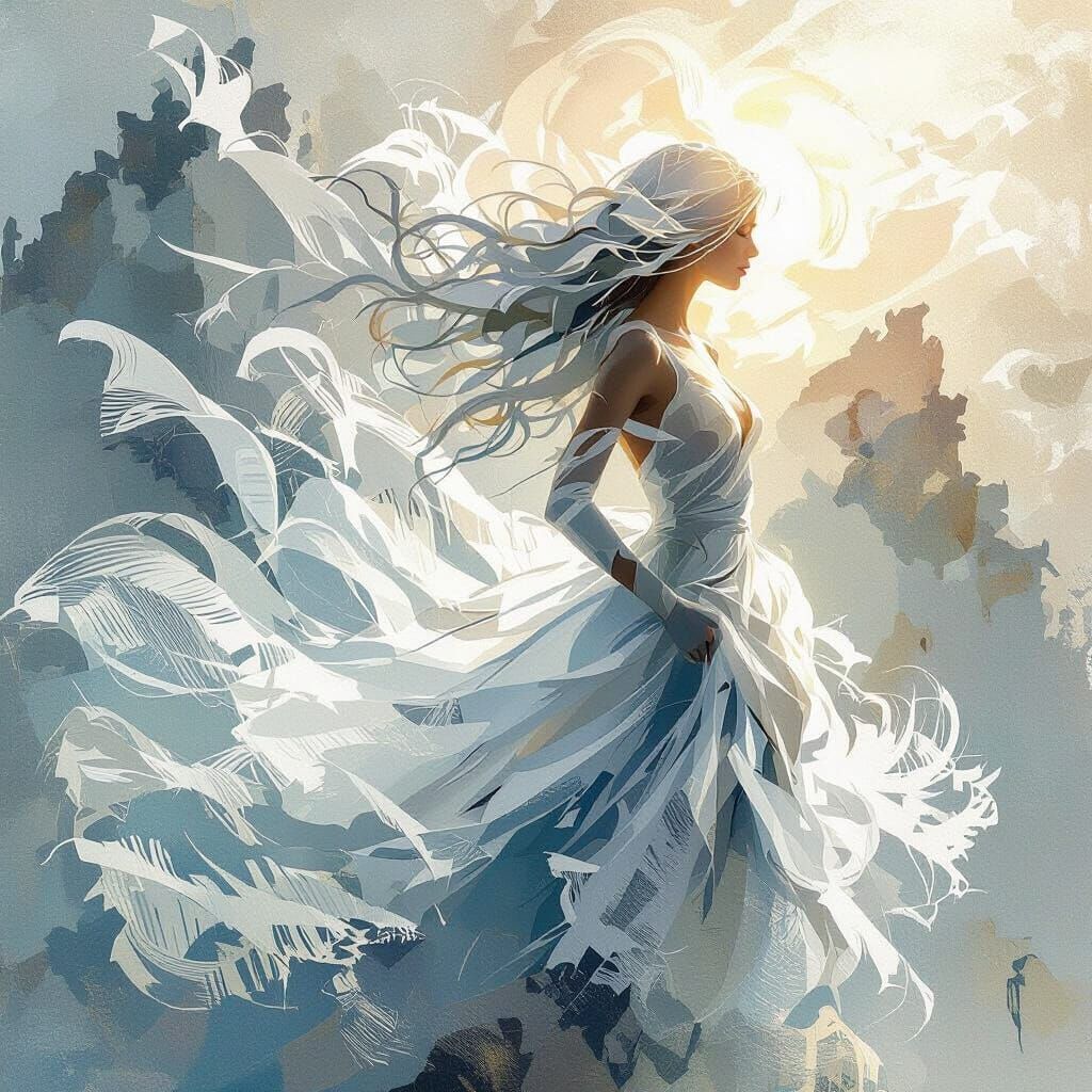 A woman in a white skirt stands in golden sunlight, inspired by abstract surrealism. The image evokes modern painting with watercolor elements and a poster-like quality.