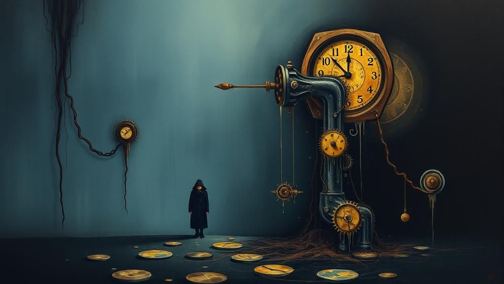A surreal image of a figure fading into darkness amidst a warped landscape. The artwork features melting clockwork, oil paint swirls, and a dark gradient background, realized in a surrealist style.