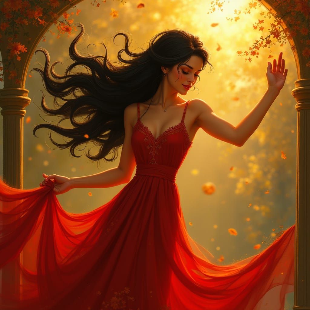 An elegant woman with black hair dances in a red dress beneath a warm sunbeam. Features intricate Art Nouveau details and vibrant colors.